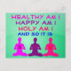"Healthy am I, Happy am I, Holy am I, And so it is" - A daily affirmation recommended by medium James Van Praagh. Positive affirmations help call into action higher energy. They help us resonate with the Awesomeness of the Universe.There are three meditating people below the affirmation.