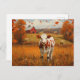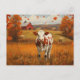 A peaceful dairy cow standing in an autumn farm landscape with golden fields and falling leaves.
