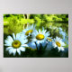 It's a bright, sunny day. Five wild daisies with cheerful yellow centers and white petals are in the foreground. A shimmering pond surrounded by green shrubs and trees is in the distance. Someone just might wander through and pick off each petal while saying "he loves me, he loves me not".