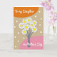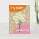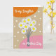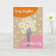 This design shows a bouquet of seven white flowers with sunny yellow centers, arranged so they feel like a gentle gift being offered with affection ❤️. The petals have a lightly layered look that adds soft depth against the flat background, like two friends sharing a quiet, happy moment. Behind them, the top area is a warm orange curve that leans in over a wide sandy beige middle, creating a cozy, welcoming setting. Small white circles scatter across the beige area like floating confetti, adding a light, celebratory touch 🌼. A pale pink arc sits along the bottom edge and helps the flowers feel grounded, as if resting on a soft surface. The message “To my Daughter” appears in white lettering curved along the top, while “on Mother’s Day” is placed near the bottom in the same white style. Muted gray stems extend downward from the blooms, linking the bouquet to the lower portion of the design. The orange band curves across the top, the beige center is dotted with white circles, and the pink arc forms a smooth base beneath the gray stems.