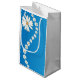 Gift bag shown in a solid color of white with a cute blue daisies print.