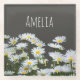 Modern, stylish personalized coaster with sunny daisies on dark grey background.