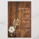 Customize the casual yet classy White Daisy and Horse Bit Country Western Wedding Menu with the details of the meal that you will serve at your farm style or ranch theme bridal shower luncheon, wedding brunch or barn party marriage reception dinner by adding the salad or first course, entree or second course and dessert or third course. This rustic chic custom equine theme nuptial menu features a quaint floral photograph of a white daisy flower blossom, pearl necklace, horse bit and leather reins with a brown weathered barn wood background.