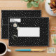 Lady bug and white daisy bouquet with white satin bow on white polka dots and black background.