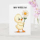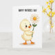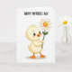This card shows a plump yellow feathered bird standing upright on a white background, holding a big daisy like a shy little offering ❤️. Soft gold and amber shading gives its fluffy body a gentle glow, and a faint shadow sits under its bright orange webbed feet. The bird’s dark eyes, framed with tiny lashes, look straight ahead with a tender, affectionate focus, and a light blush warms its round cheeks. Its orange beak points toward the flower as if it’s about to present it to someone close, turning the simple pose into a quiet moment of friendship. The daisy has crisp white petals around a warm golden center, and the stem is a fresh green that adds a spring touch 🌼. Near the top of the card, a short greeting appears in dark lettering, centered above the illustration and easy to read. The white space around everything stays open and airy, with the flower held slightly to one side of the bird’s chest.