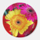 Photograph of beautiful yellow, hot pin, and red daisies.