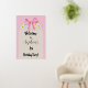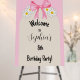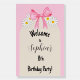 Daisy Flower and Bow Birthday Welcome Sign, Foam Board. Personalize your birthday party with a custom sign! This adorable pink floral design features white daisies with golden yellow centers and soft watercolor-style pink bows with a pastel pink background. This charming feminine aesthetic is perfect for a girly party. The daisy and bows create a playful cottagecore vibe that is both trendy and timeless.