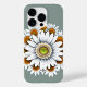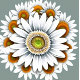 A digital painting features a cluster of daisies arranged in a circular pattern against a solid gray background. The daisies are rendered with a clean, graphic style, emphasizing their geometric shapes and contrasting colors. The petals of the daisies are predominantly white, with subtle gray shadows that give them a three-dimensional appearance. The petals are smooth and have a slight sheen, suggesting a polished or glossy finish. The centers of the daisies vary in color, with some featuring a bright orange hue and others displaying a mix of yellow and green. The central disk of the largest daisy is particularly detailed, with a textured pattern that mimics the natural structure of a flower's seed head. The overall composition is balanced and symmetrical, with the daisies arranged in a way that draws the eye to the center of the image. The use of a solid background helps to isolate the flowers and emphasize their form and color. The painting has a modern, minimalist aesthetic, with a focus on clean lines and simple shapes.