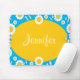 Nothing brings sunshine and happiness like white and yellow Daisies. This cute mousepad features abstract daisy flowers and butterflies on a bright turquoise blue background. The mousepad is customized with your name printed on a bright golden yellow center oval circle. Personalized floral mousepads make great gifts for yourself or the special flower lover in your life.