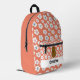 Adorable backpack featuring a cute happy cartoon brown potato. The background is a cute floral pattern of white daisy flowers on a salmon pink color. A template below the potato to add your name.