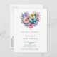 Birthday party invitation postcard with a beautiful illustration. A heart-shaped bouquet of flowers in pastel blue, green, purple and yellow. With a lovely blue butterfly hovering in front.