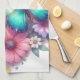 A kitchen towel with a beautiful illustration. A bouquet of flowers in pastel blue, green, purple and yellow. With a lovely blue butterfly hovering in front.
