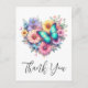 Thank you postcard with a beautiful illustration. A heart-shaped bouquet of flowers in pastel blue, green, purple and yellow. With a lovely blue butterfly hovering in front.