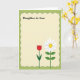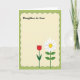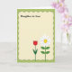 The front design shows a light cream panel framed by a deep green scalloped border, giving the layout a soft, cozy feel. Near the top, the words “Daughter-in-Law” sit centered in a dark tone, leaving open space below for a note. At the bottom, two tall flowers lean gently toward each other like close companions, adding a quiet romantic warmth ❤️. One flower is a red tulip-like bloom with smooth curved petals on a slim green stem, and the other is a white daisy-like flower with a sunny yellow center and sturdy green stem. Small shadows beneath the petals and leaves create a subtle layered look without feeling heavy. The inner green frame has tiny dotted details that resemble careful stitching, while a wider lighter-green margin surrounds it. A dashed line traces near the edge of the outer green area, keeping the border tidy and decorative 🌼. The red bloom stands on the left and the white daisy-like flower stands on the right, both rooted along the creamy base.