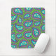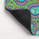A mouse pad with a green and purple paisley design. The paisley has daisies in the middle against a light blue background.