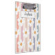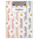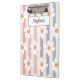 This floral clipboard is decorated with white daisies on a striped background in pastel colors. Easily customizable with your name. Great for Back to School or as a gift.