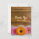 Send a warm message of gratefulness and gratitude after an engagement party, bridal shower or wedding with the country chic Daisy Trio Country Barn Wedding Flat Thank You Note. These informal yet elegant custom farm or ranch style theme thank you notes feature a quaint floral photograph of two pink gerber daisies and one orange daisy flower blossom with a white bridal veil and a weathered brown barn wood background.