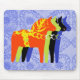 Red, green, black & blue horses on a blue background designed after a Scandanavian folk dala horse.