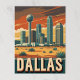 A vintage-style travel poster showcases the Dallas skyline, featuring the iconic Reunion Tower and other modern skyscrapers against an orange and red sunset over a desert landscape with sparse vegetation. "DALLAS" is boldly displayed at the bottom within a decorative border.