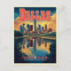 Transport yourself to the vibrant city of Dallas with our stunning retro travel poster postcard. Featuring a bold, colorful skyline, geometric patterns, and iconic lettering, this postcard captures the essence of the Lone Star State.