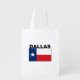 Show off your hometown pride with this Dallas, TX reusable grocery bag. This grocery bag displays the text "Dallas" with a Texas flag underneath.