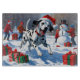 A spotted Dalmatian runs playfully through the snowy winter scene, wearing a festive red Christmas hat. This lively design highlights the breed’s distinctive coat, energetic personality, and cheerful spirit while capturing the warmth and joy of the holiday season. A heartwarming winter moment full of festive charm.