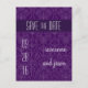 A beautiful art deco inspired damask pattern in violet purple serves as a lovely background for this Save the Date postcard. The main message stands out in a deep purple panel at the top. Add the date of the big event to the left with the couple's names to the right and the detailed information on the reverse. A great inexpensive alternative for save the date announcement. Available in alternate colors with matching products.
