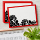 Damask black and white envelope. Design Features a black damask swirly print with a red border and white background.
