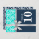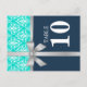 © 2013 Socialite Designs. Our elegant white damask table number card has a faux silver ribbon and bow design and is a perfect addition to your wedding or special event. The background has colors of navy blue and aqua turquoise. Just replace the number on the card for each table. Do you like this design but would like to have it in a different color, please do not hesitate to contact Socialite Designs. PLEASE NOTE THAT THE RIBBON IS AN IMAGE AND PRINTED ONTO THE CARD.