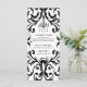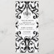 This dinner party menu design features a chandelier silhouette, bats, a spider and a black cat on a black and white damask background. You can personalize with all your menu details.