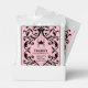 This design features a spider dangling from a black damask pattern on a pink background. In the center is text that reads "Thank you for dropping by." You can personalize with a name.