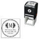Stylish personalized self-inking stamp design features a round dotted frame with a damask flourished monogram initial and return address text.
