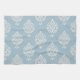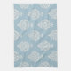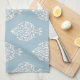 Ornamental damask surface pattern design in cream color detail on a light blue background.