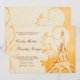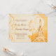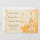 Swirls billow and curl about a burnt sienna hand-drawn Eiffel Tower against lavish, floral yellow and orange damask, accented with faint touches of a stylized dandelion pattern. A French love poem is faintly inscribed in the cream background, providing the perfect accompaniment to the customizable wedding invitation wording in script and engraving style fonts, also in burnt sienna.