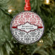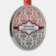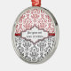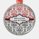 Damask pattern black red white custom ornament. The upper part is of red and white damask pattern and the bottom part is of black and white. A red stripe separates the two parts. Your text is typed on an elegant label with white and red outline. A great keepsake for special occasions weddings, birthdays, anniversaries.