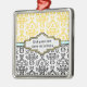 Damask pattern black white yellow aqua ornament. The upper part is of yellow and white damask pattern and the bottom part is of black and white. An aqua stripe separates the two parts. Your text is typed on an elegant label with white and yellow outline. A great keepsake for special occasions weddings, birthdays, anniversaries.
