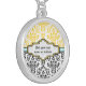 Damask pattern black white yellow aqua custom silver necklace. The upper part is of yellow and white damask pattern and the bottom part is of black and white. An aqua stripe separates the two parts. Your text is typed on an elegant label with white and yellow outline.