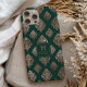This phone case features an ornate vintage pattern of rose gold damask on an emerald green background. Personalize it with your initial and name in serif font, framed by an emerald green and rose gold square.