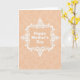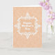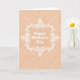 This design shows a tall, centered layout framed by an ornate white border filled with delicate curls and scrolling flourishes that feel like a gentle embrace. Inside the frame, a soft peachy‑pink panel sets a romantic, friendly tone, like a quiet moment shared close together ❤️. The main message sits centered within that inner panel in simple white lettering, standing out clearly against the warm background. Behind everything, the full card face carries the same peachy‑pink color, giving the scene a calm, cozy setting. A faint, tone‑on‑tone damask pattern spreads across the backdrop with barely-there floral shapes, adding depth without stealing attention. The contrast between the crisp white frame, the white text, and the muted patterned background creates a balanced look that feels tender and inviting 🌼. The frame’s intricate white scrollwork surrounds the centered white text on a peachy‑pink field, with a subtle damask floral pattern fading into the background.