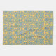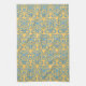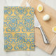 This kitchen towel has a damask element / motif, created by Kristie Hubler, repeated, in a robins egg blue / ocean blue / aqua blue color, with a light yellow pumpkin / Italian / Mediterranean gold colored background. Old worldly, again, Mediterranean looking.