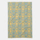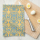 This kitchen towel has a damask element / motif, created by Kristie Hubler, repeated, in a robins egg blue / ocean blue / aqua blue color, with a light yellow pumpkin / Italian / Mediterranean gold colored background. Old worldly.