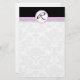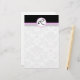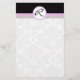 A muted Damask pattern covers the entire background of this elegant stationery. Topped with a thick black line, a pink ribbon with a monogram inside a circle. Also available in other colors. Ideal for formal letter writing or special occasion letters.