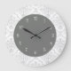 Gray and white damask wall clocks with pretty damask pattern and fancy numbers on the clock face in this decorative wall decor clock design for your kitchen, dining room, or any room in your house you want to add some color and character. Colors include gray and white.