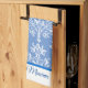 A kitchen towel with an elegant damask pattern of vintage daisies and leaves with scrolls in white on cornflower blue, with a border of white with space for your name in blue.