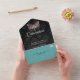 Pretty Quinceañera birthday party all in one invitation, done in a black on black damask pattern, on the inside, with a pretty pastel dragonfly, at the top. The outside is done in a aqua damask pattern. Personalize the custom text for your favorite girl's special day.