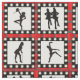 4 different silhouettes of cabaret style dancers printed inside of a light up frame with a red brick background print on fabric.