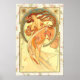 For The Dance Mucha was inspired by the beauty of nature. The use of autumnal colours (browns, yellows and orange) and motifs (falling leaves dancing in the autumn breeze), draw your eyes to the lone woman posing provocatively, seductively glancing back over her shoulder, while her orange dress and long aubern hair blow wildly in the autumn morning breeze.