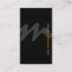 This elegant bold script dancer business card features a large bold script dark grey monogram right in the middle of the card over a black background. Your name and title appear vertically on the right edge of the card in orange and white. Your other contact details including your business logo appear on the back of the card. The back of the card also features a smaller monogram letter in the same script font. Perfect for artistic, entertainment, showbusiness, performance, performers, talent themes.
