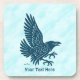 A simple, blue silhouette-like image of a lively raven (Corvus corax) done in Norse-Celtic style, superimposed on a snowy background image. Customize by adding your own text.