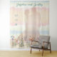 Dancing couple wedding backdrop / photo booth background. Pastel colors, with bottom border of wildflowers. A couple dancing is in silhouette over a background of pastel watercolors. Include the names of the bride and groom at the top in blue script. Also, list the marriage date in vertical numbers on the left side. Shown on the largest fabric, with smaller sizes available.
